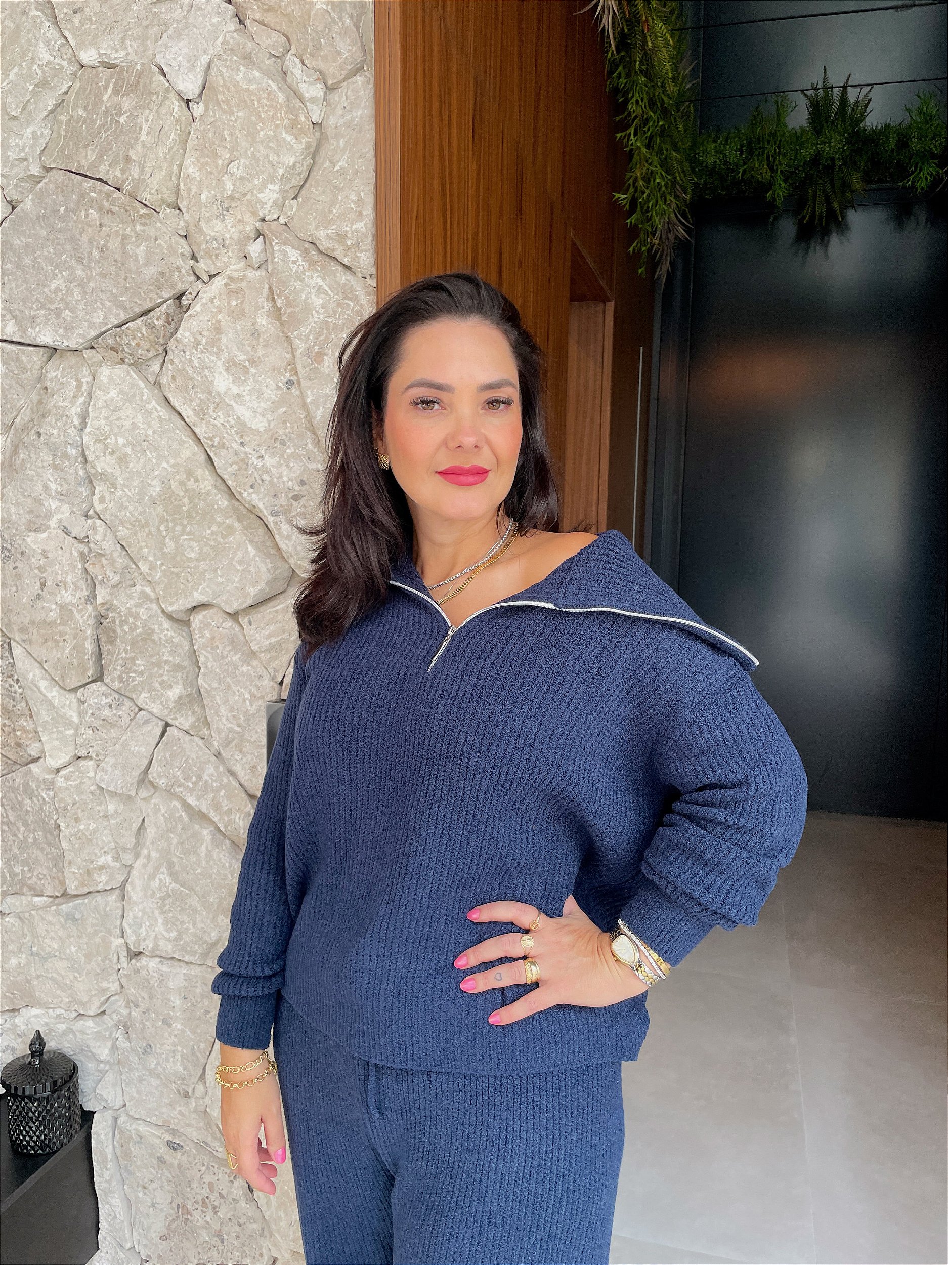 Conjunto de calça e blusa em tricô mousse. Calça em corte reto com cós de elástico e blusa com mangas longas com detalhe na gola de zíper. Ideal para quem busca conforto, estilo e praticidade.