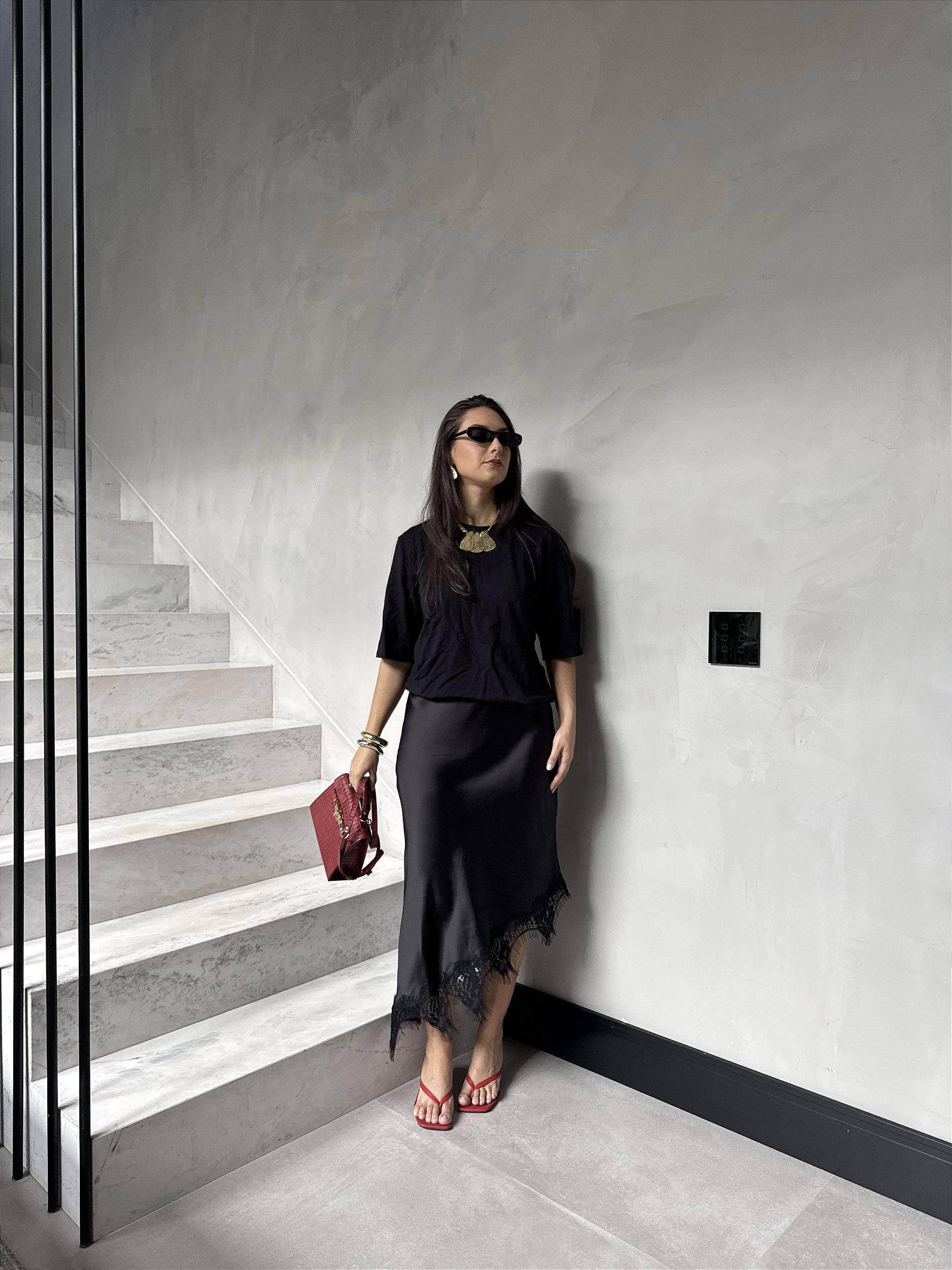 Saia midi confeccionada em cetim de alta qualidade. Possui modelagem reta com caimento assimétrico com acabamento em renda super delicada. Conta com cós em elástico e pode ser usada como top tomara que caia.