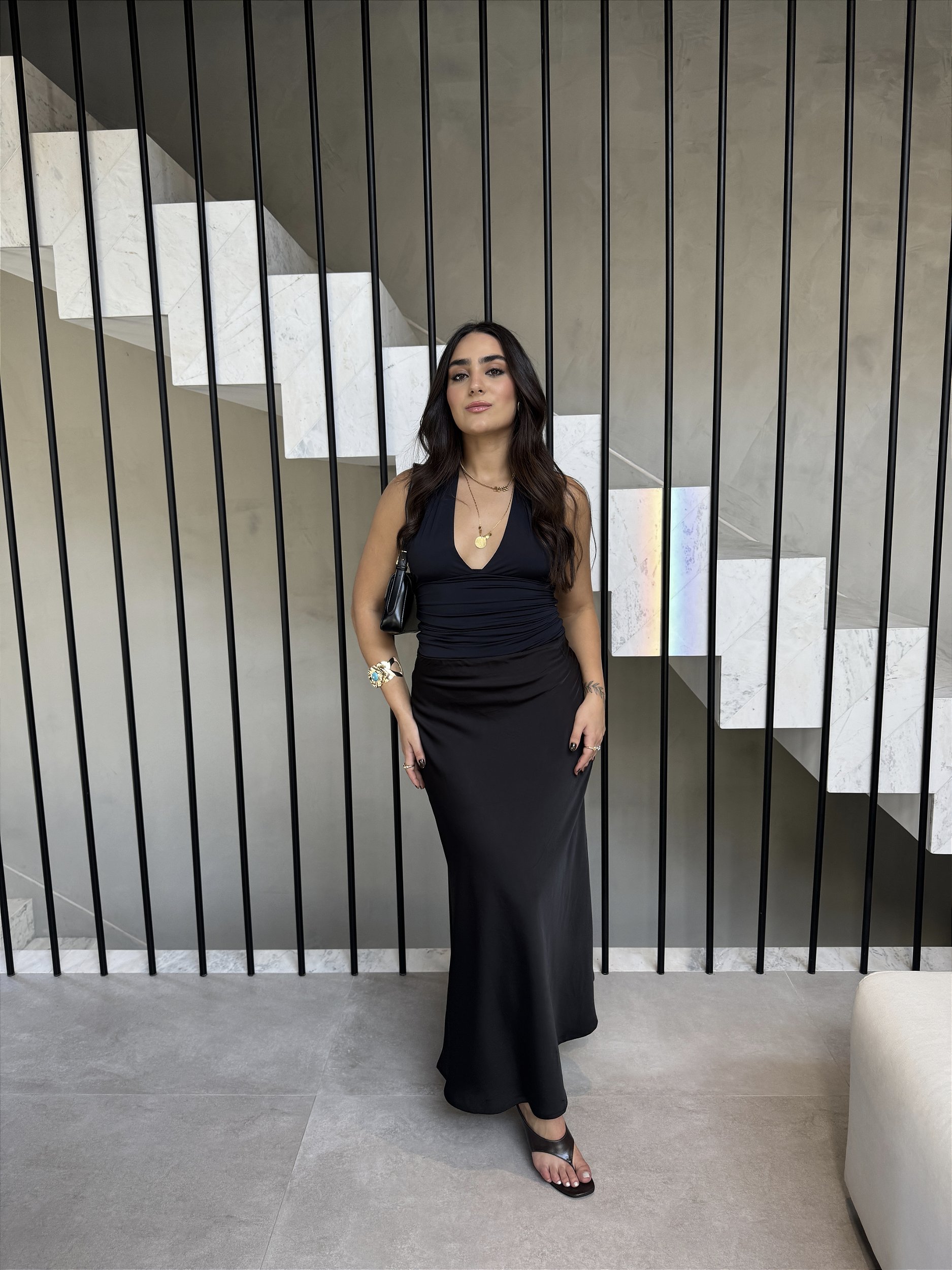 Saia midi com toque acetinado, possui elástico na parte da cintura e fechamento por zíper na lateral