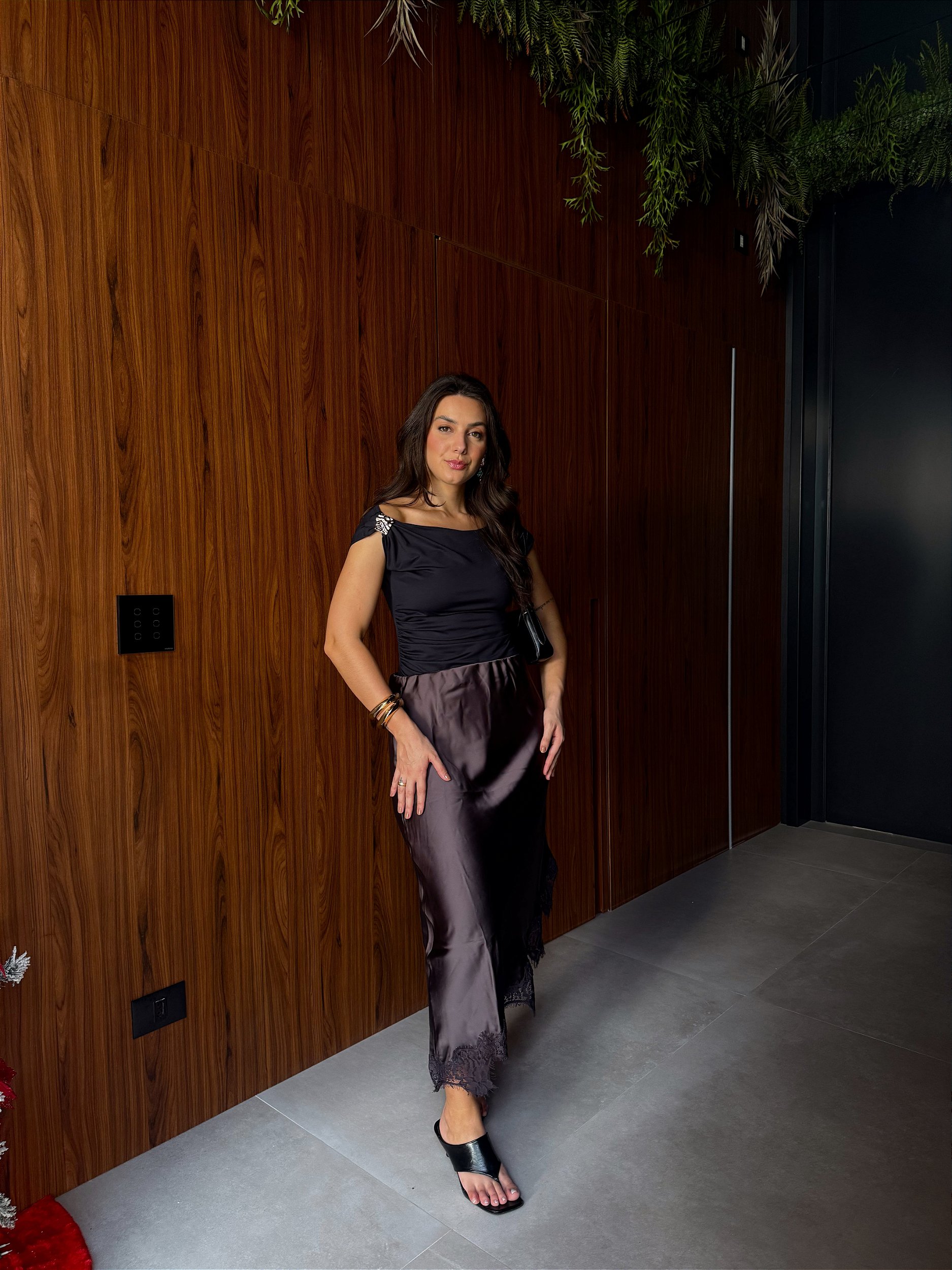 Saia midi confeccionada em cetim de alta qualidade. Possui modelagem reta com caimento assimétrico com acabamento em renda super delicada. Conta com cós em elástico e pode ser usada como top tomara que caia.