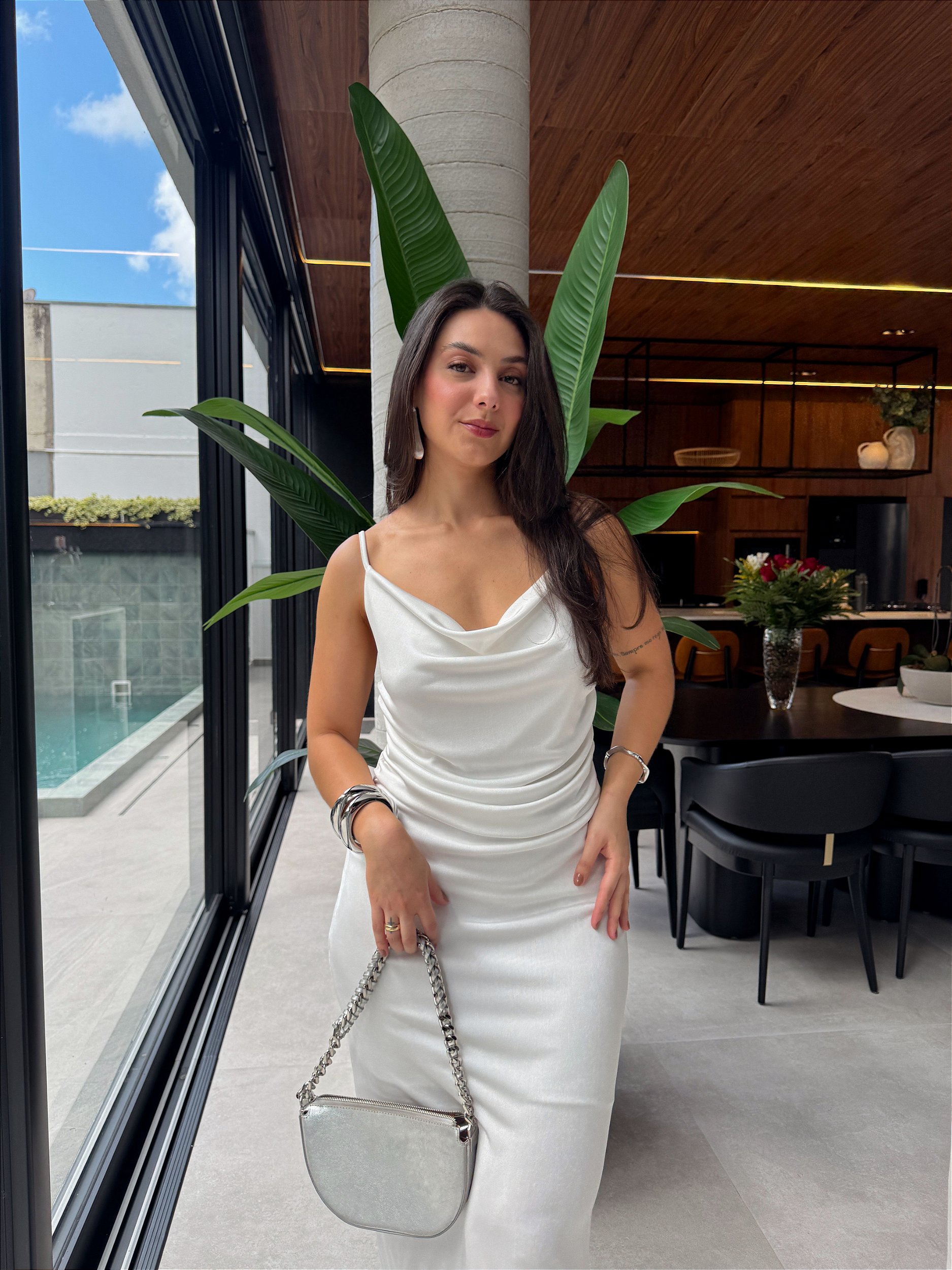 Vestido no estilo slip dress com decote degagê e comprimento longo. As alças possuem regulágem e a barra conta com uma fenda.