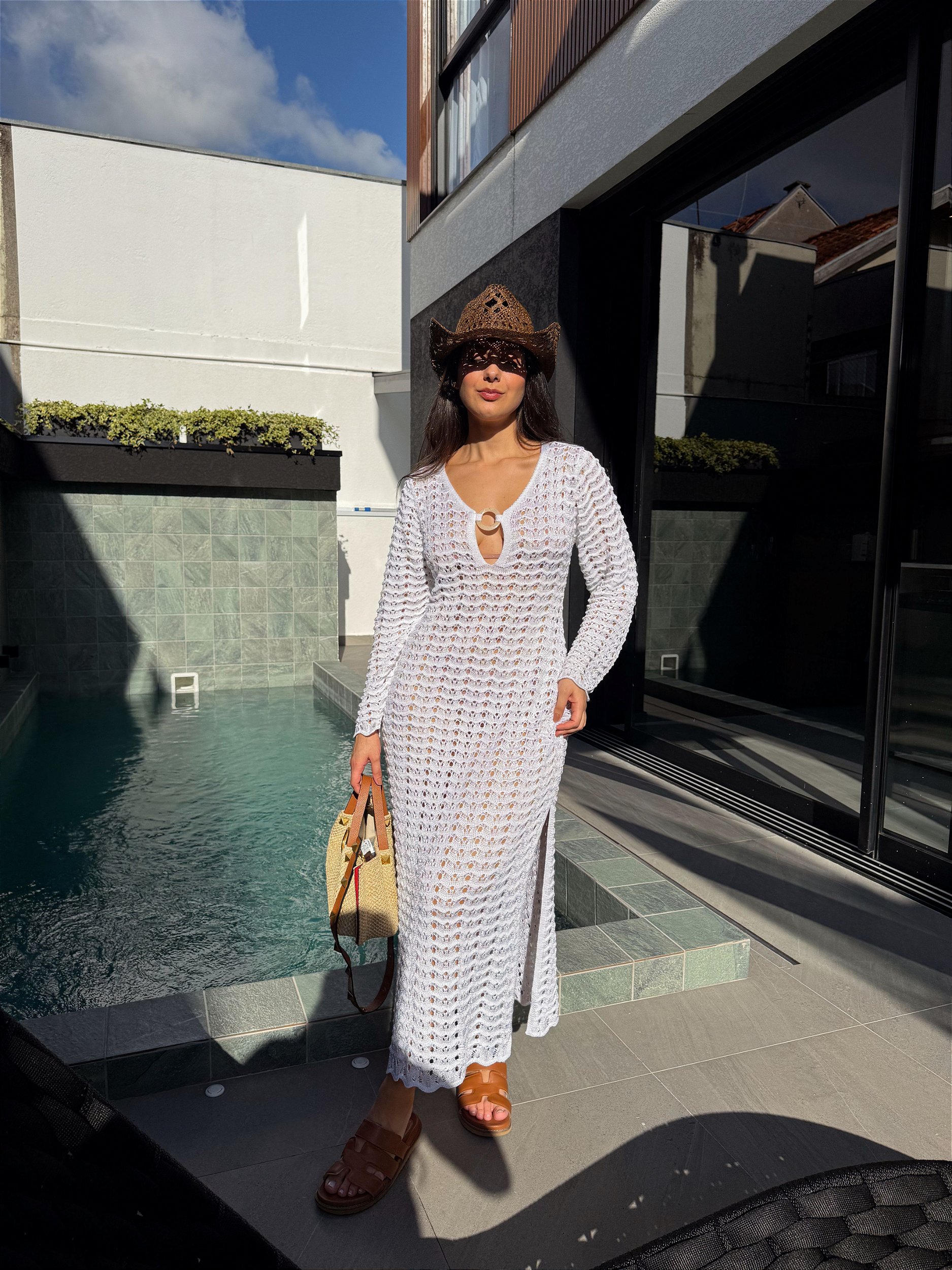Vestido de tricô com mangas longas e comprimento longo que pode ser usado como uma saída de praia também. Possui decote com detalhe de aviação em acrilíco.