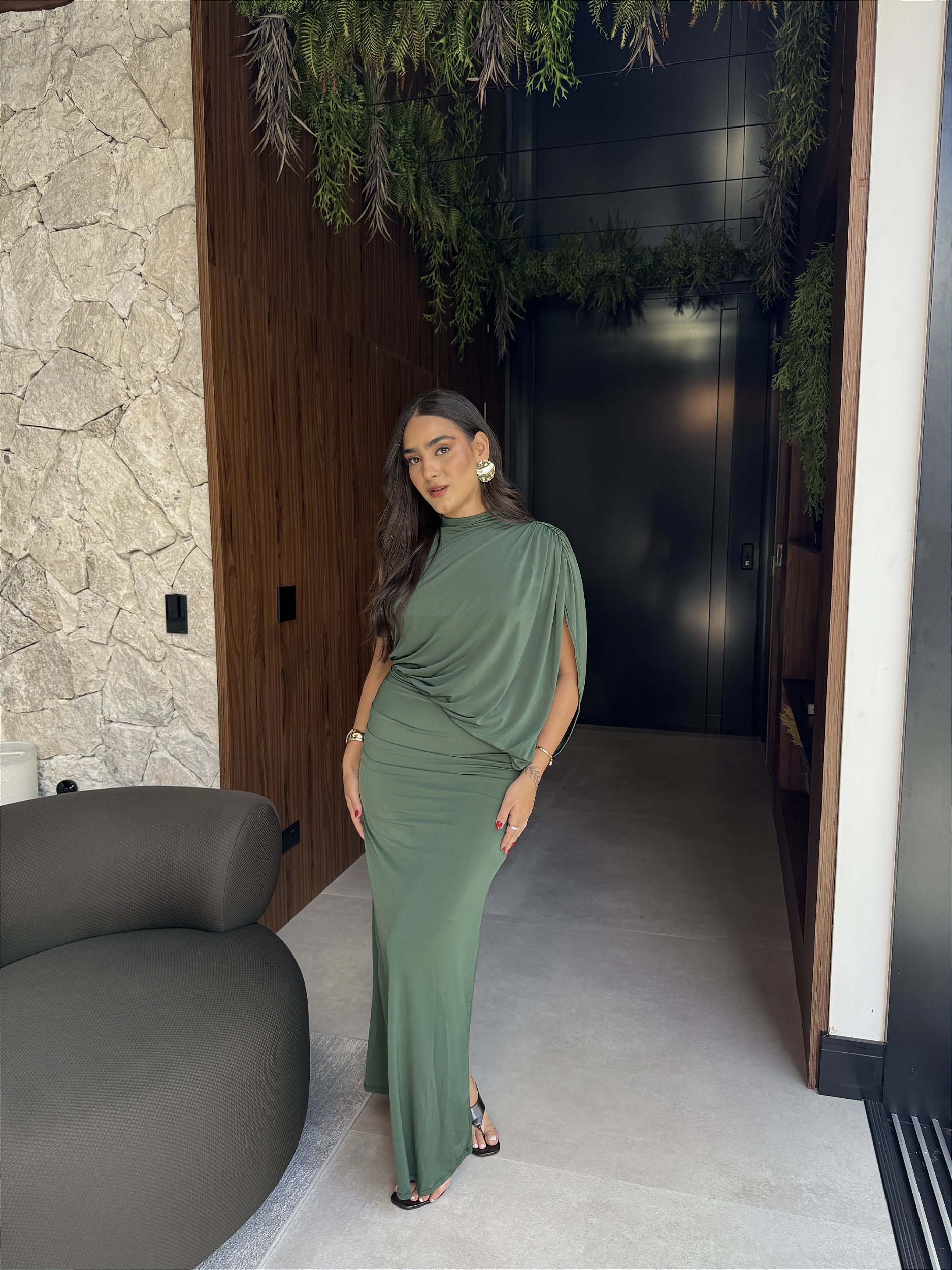Uma peça que traduz sofisticação, conforto e exclusividade para mulheres que buscam se destacar com elegância. Com modelagem tradicional e caimento acinturado, este vestido longo é perfeito para criar produções marcantes em qualquer estação. Design exclusivo com gola alta e manga assimétrica tipo capa, com ombro descoberto, conferem um visual moderno e refinado. Os detalhes de franzidos e drapeados laterais, aliados ao recorte na cintura, valorizam a silhueta feminina com charme e delicadeza.