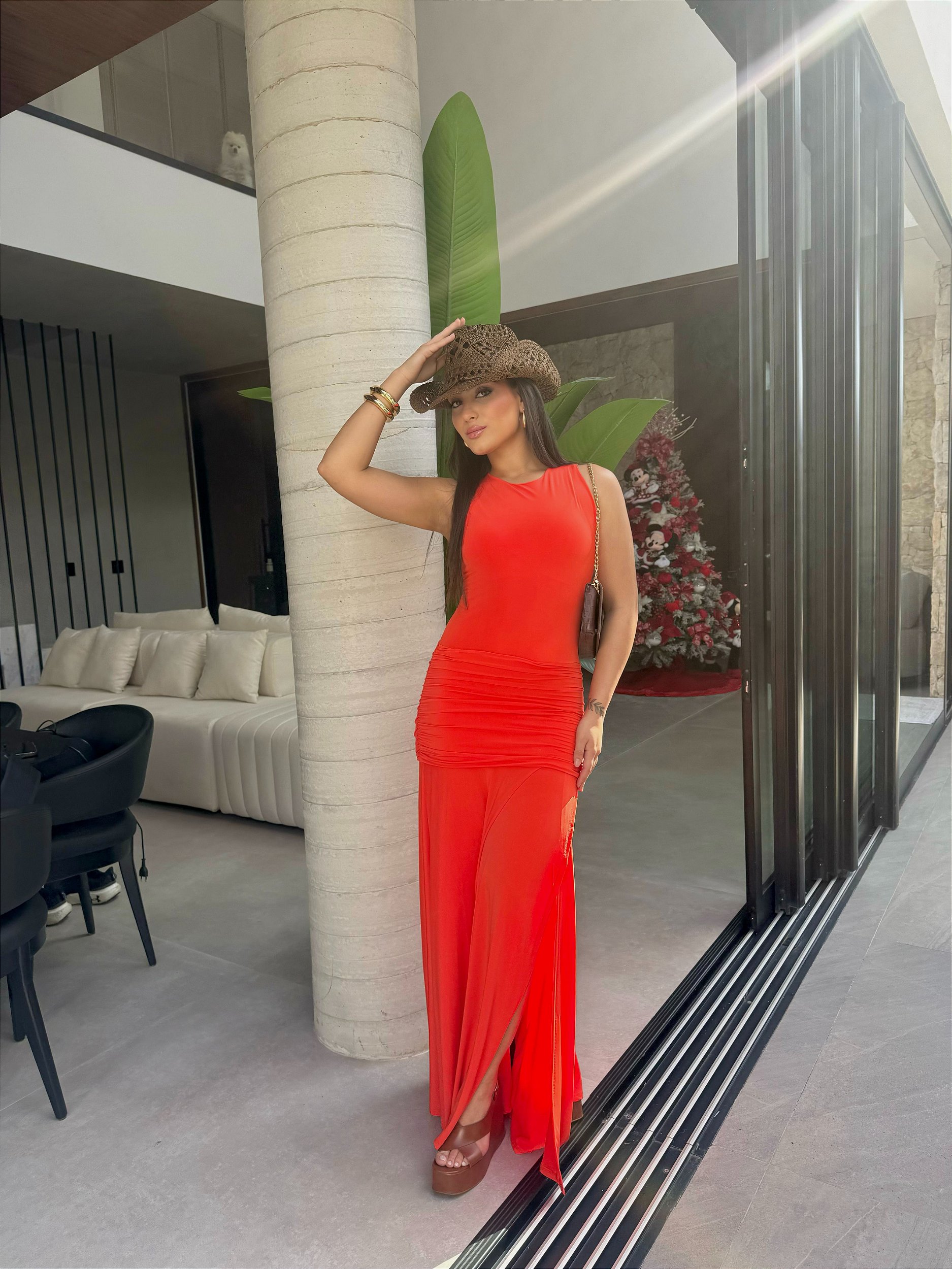 Vestido longo ideal para compor produções sofisticadas. Conta com sobreposição de tecido na cintura, franzido lateral e fenda que valoriza a silhueta. Possui tecido duplo com forro, oferecendo conforto e acabamento elegante.